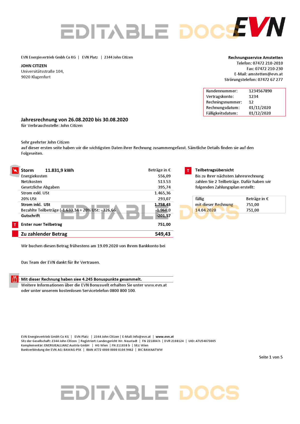 Austria EVN electricity utility bill Word and Pdf Template use for :