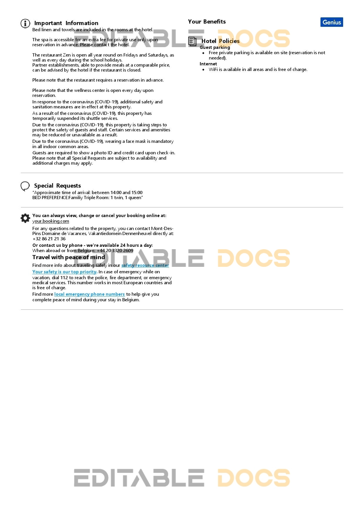 Are you in need of a hotel or Airbnb booking confirmation for your needs? Look no further! Mr. Verify’s editable templates are perfect for providing proof of accommodation and showing expenses, making the fake booking process even more authentic and reliable. Our templates come in both Word and PDF formats, and are available for almost all countries. With our Belgium country name fillable booking form templates, you can easily customize your booking confirmation to fit your specific needs, saving you time and hassle. And if you need any help with editing or construction works, our specialists are ready to assist you at affordable prices. Our support team is also available online to answer any questions you may have.