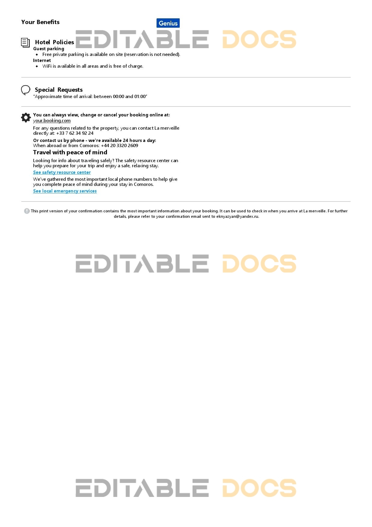 Are you in need of a hotel or Airbnb booking confirmation for your needs? Look no further! Mr. Verify’s editable templates are perfect for providing proof of accommodation and showing expenses, making the fake booking process even more authentic and reliable. Our templates come in both Word and PDF formats, and are available for almost all countries. With our Comoros country name fillable booking form templates, you can easily customize your booking confirmation to fit your specific needs, saving you time and hassle. And if you need any help with editing or construction works, our specialists are ready to assist you at affordable prices. Our support team is also available online to answer any questions you may have.