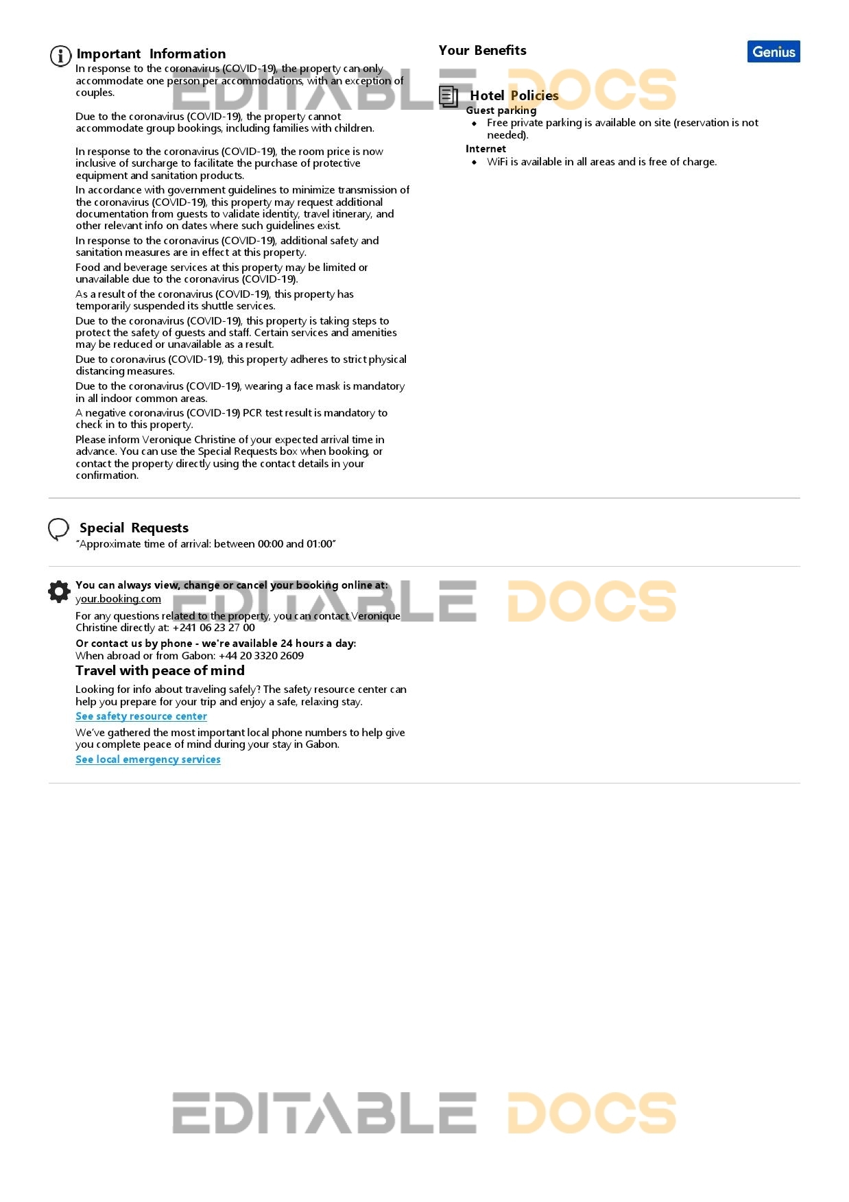 Are you in need of a hotel or Airbnb booking confirmation for your needs? Look no further! Mr. Verify’s editable templates are perfect for providing proof of accommodation and showing expenses, making the fake booking process even more authentic and reliable. Our templates come in both Word and PDF formats, and are available for almost all countries. With our Gabon country name fillable booking form templates, you can easily customize your booking confirmation to fit your specific needs, saving you time and hassle. And if you need any help with editing or construction works, our specialists are ready to assist you at affordable prices. Our support team is also available online to answer any questions you may have.