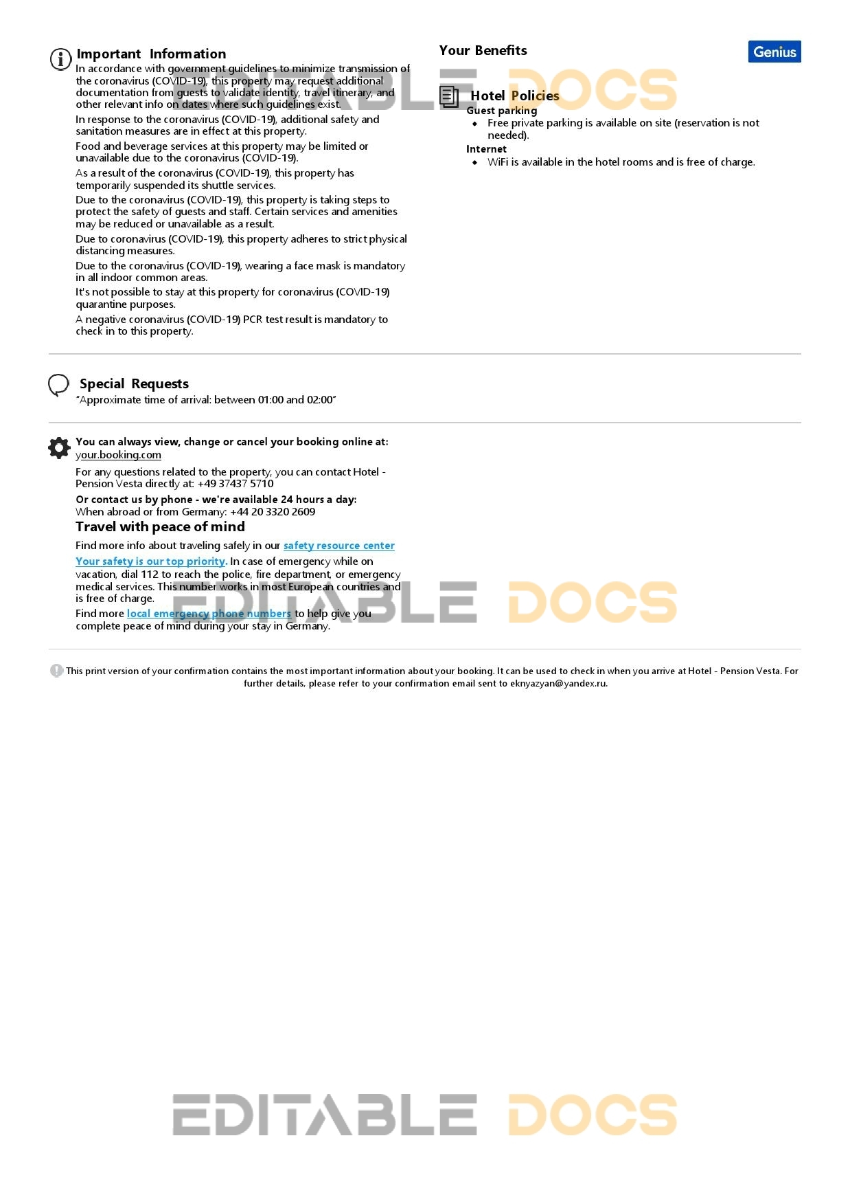 Are you in need of a hotel or Airbnb booking confirmation for your needs? Look no further! Mr. Verify’s editable templates are perfect for providing proof of accommodation and showing expenses, making the fake booking process even more authentic and reliable. Our templates come in both Word and PDF formats, and are available for almost all countries. With our Germany country name fillable booking form templates, you can easily customize your booking confirmation to fit your specific needs, saving you time and hassle. And if you need any help with editing or construction works, our specialists are ready to assist you at affordable prices. Our support team is also available online to answer any questions you may have.