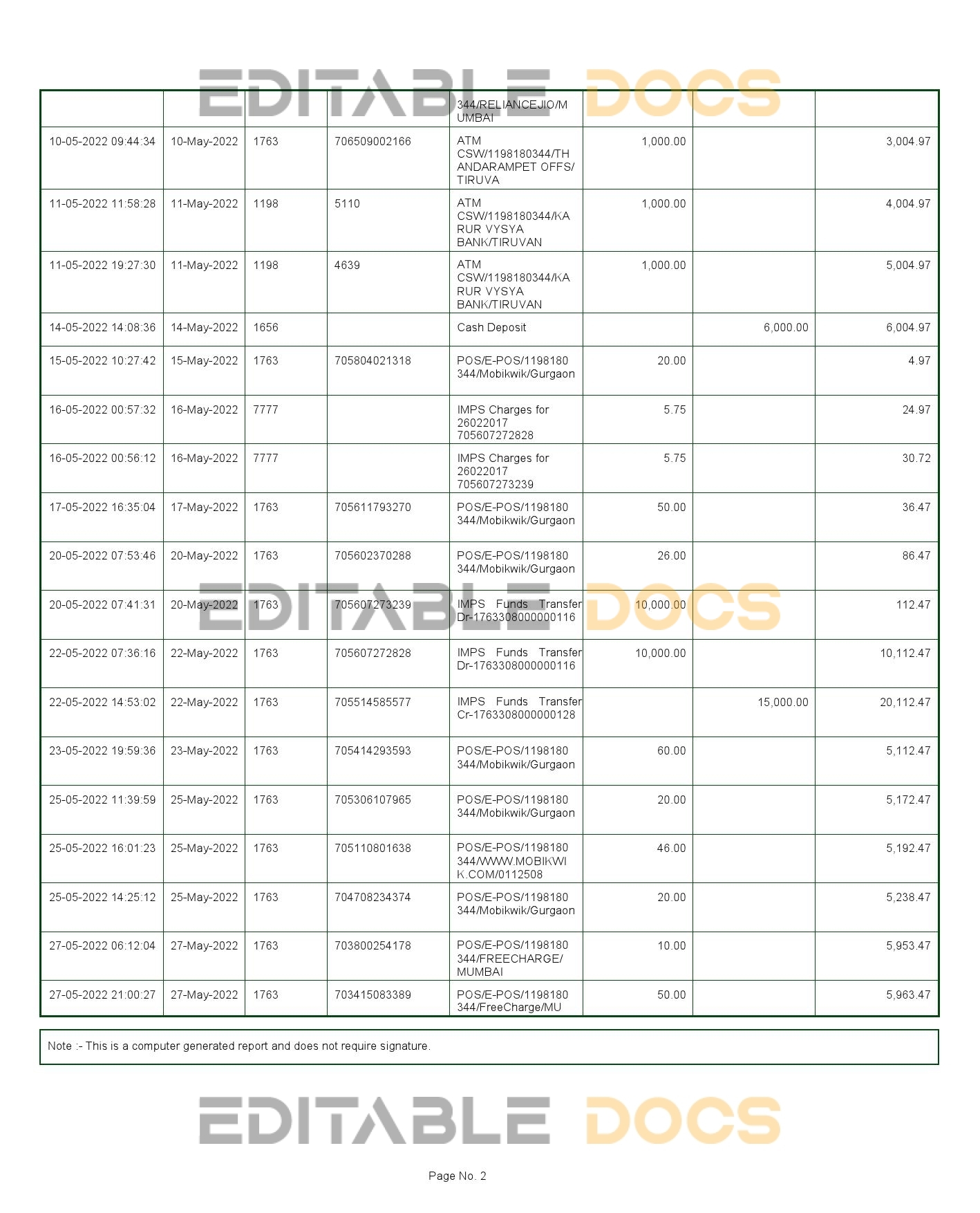 India KVB bank statement reliable Word template