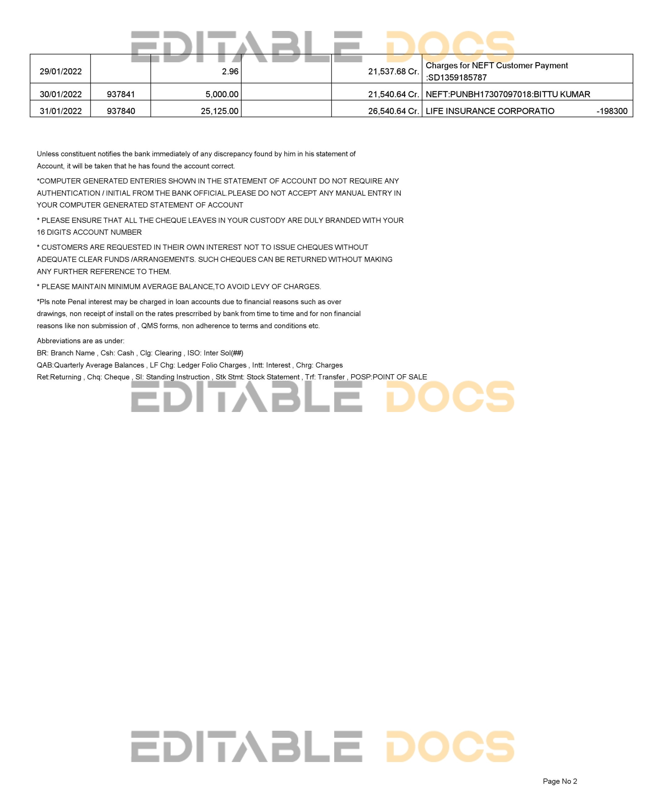 India Punjab National Bank statement reliable Word template