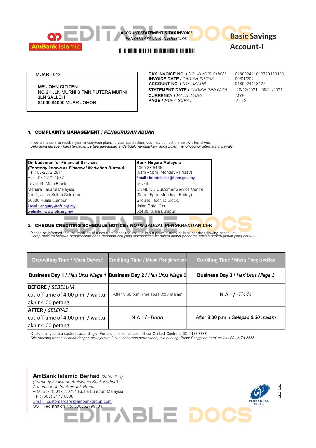 Editable-docs offers a Malaysia AmBank Islamic bank statement Microsoft excel template that can be easily modified and customized. All the necessary elements can be altered, such as a person’s name, address, ID number, birth date, height, weight, and expiration date, as well as images. This template is of a high-quality and is layer-based, so it is compatible with Microsoft excel editing software. Be cautious! Avoid low-quality free templates because they might lead to an account suspension.