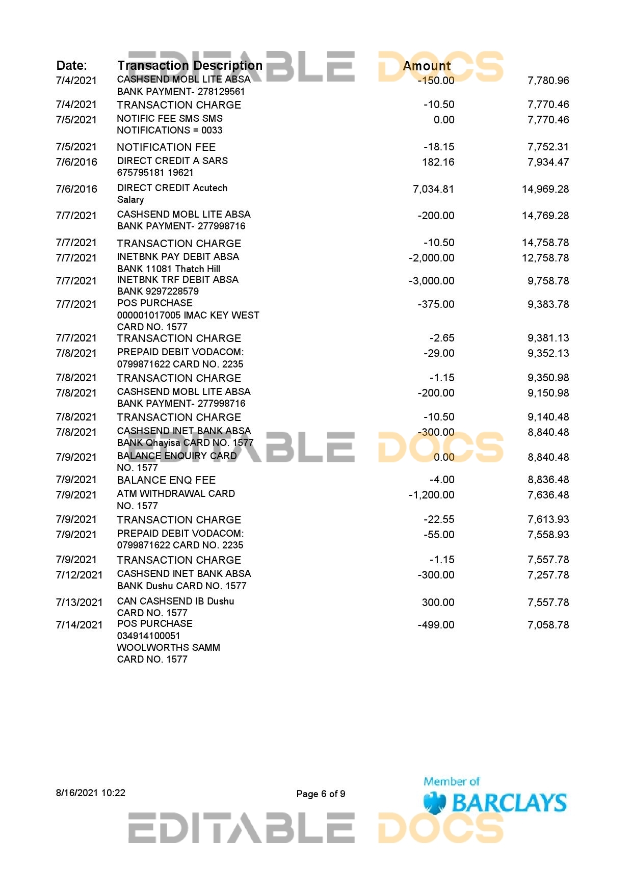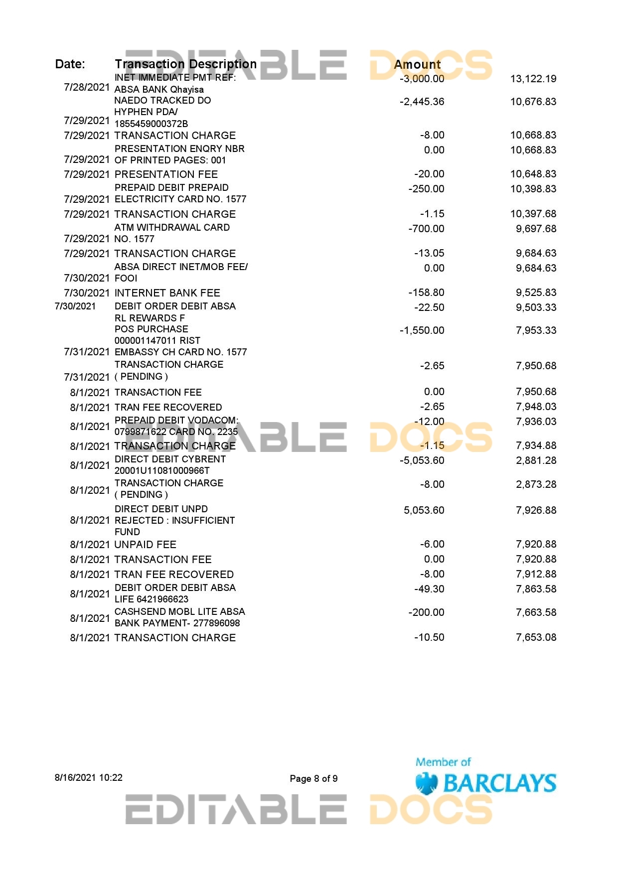 Editable-docs offers a South Africa ABSA bank statement easy to fill Microsoft excel template that can be easily modified and customized. All the necessary elements can be altered, such as a person’s name, address, ID number, birth date, height, weight, and expiration date, as well as images. This template is of a high-quality and is layer-based, so it is compatible with Microsoft excel editing software. Be cautious! Avoid low-quality free templates because they might lead to an account suspension.