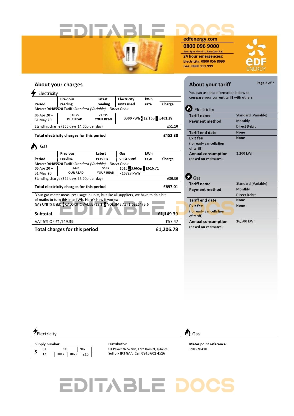 United Kingdom EDF utility bill Word and Pdf Template used for: