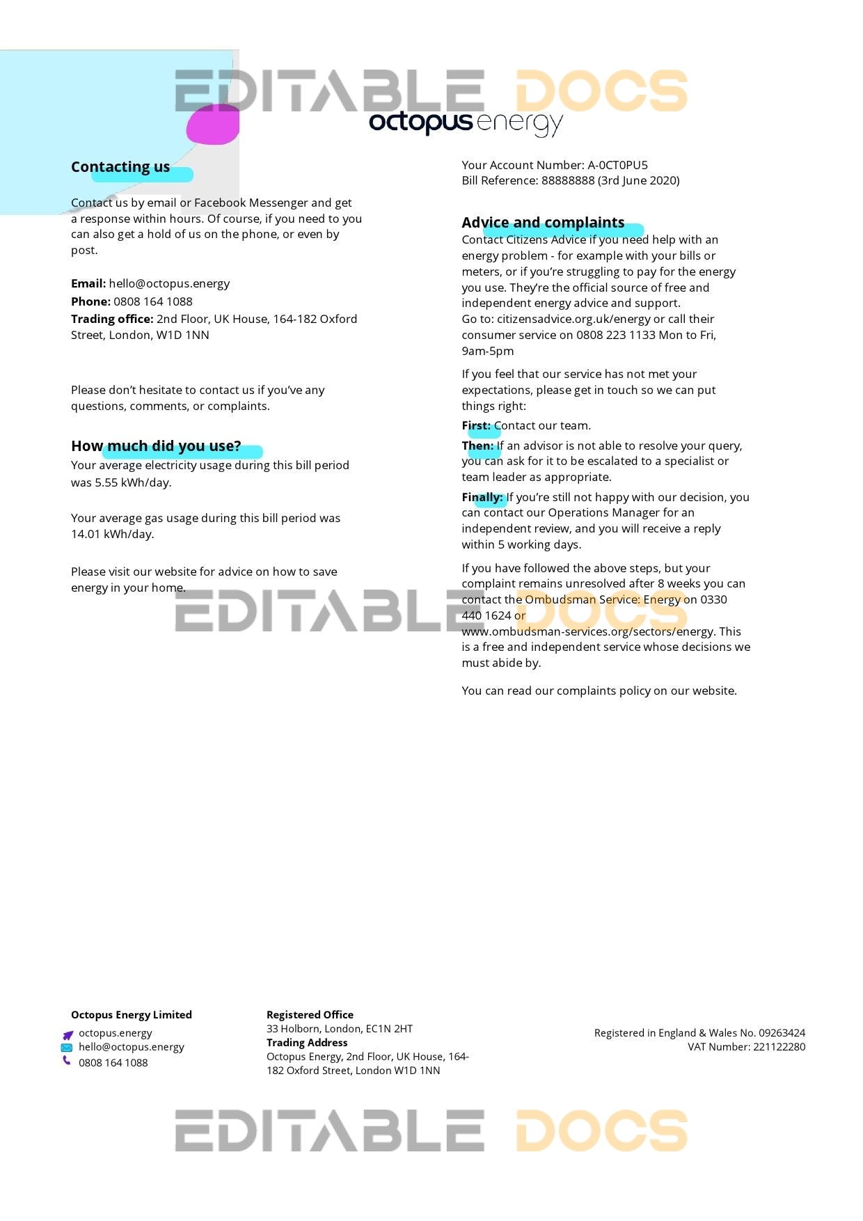 United Kingdom Octopus Energy utility bill Word template . Fully editable Word template. High quality template. Easy to customize, Layer based, fonts included. you can edit this template and put any name, address, license number, Id number, birth date, height, weight, expire date etc. This Word template is a easy to Editing.To modify this Word template file you will need a Word editing software such as Microsoft Word. Never used low quality template. Your account may be suspended.