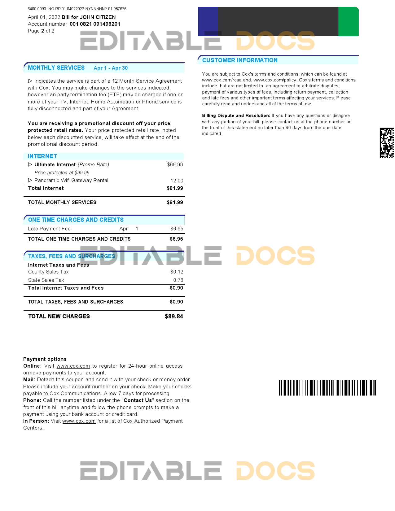 Grab now fully editable USA COX digital cable television utility bill Template from our website editable docs and put your own info to create a fake copy of Fake USA COX digital cable television Utility Bill for proof of address and ready your own novelty documents. It’ll be so beneficial if your utility bill is expired, stolen or not available. We also have passport psd template, ID Card psd template, Bank Statement psd template, drivers license psd template & Utility bill psd template