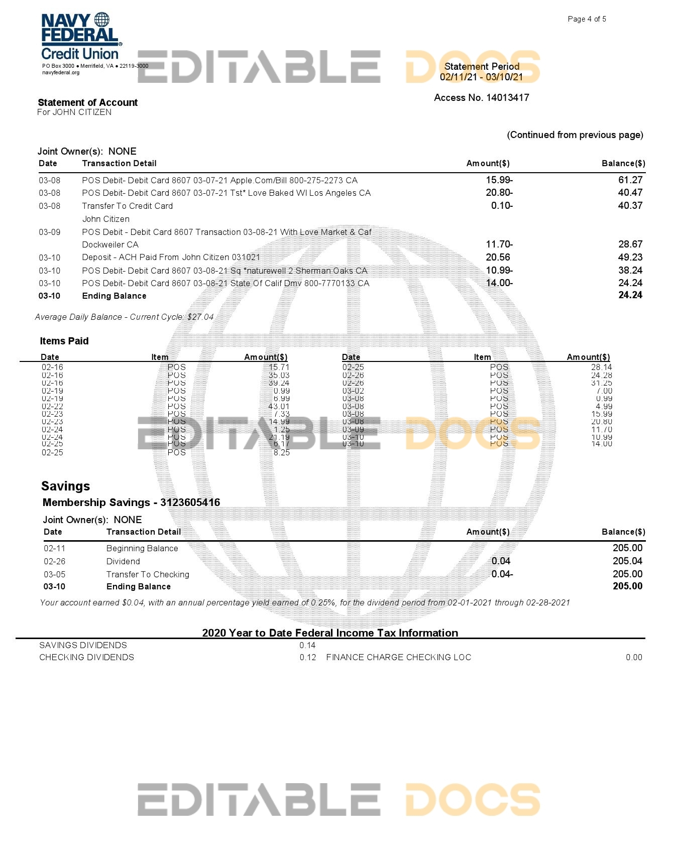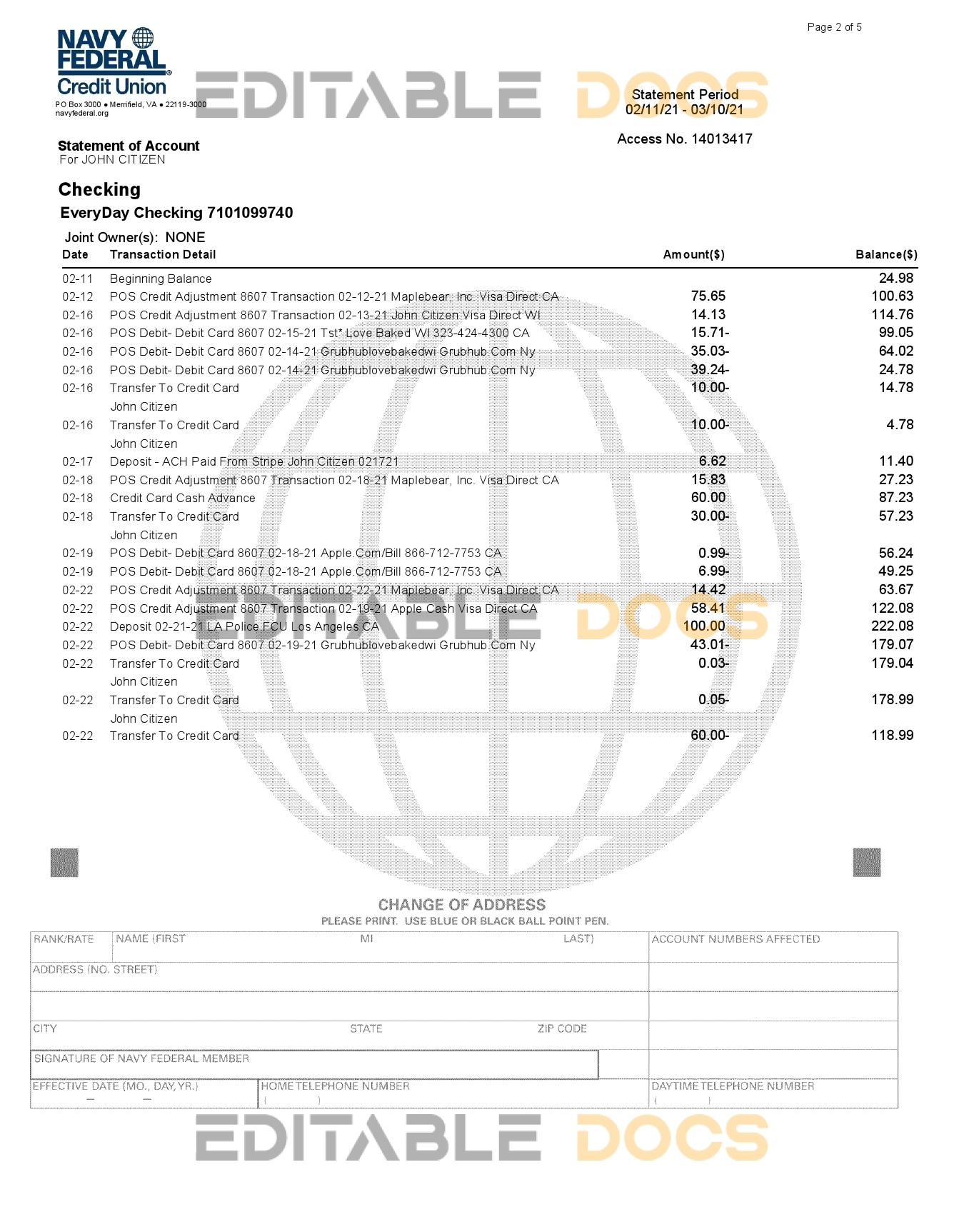 Grab now fully editable USA Navy Federal Union Word Template from our website Fake Docs and put your own info to create Fake Bank Statement Word template and ready your own novelty documents. It’ll be so beneficial if your Bank Statement is expired, stolen or not available. We also have passport psd template, ID Card psd template, Bank Statement psd template, drivers license psd template & Utility bill psd template